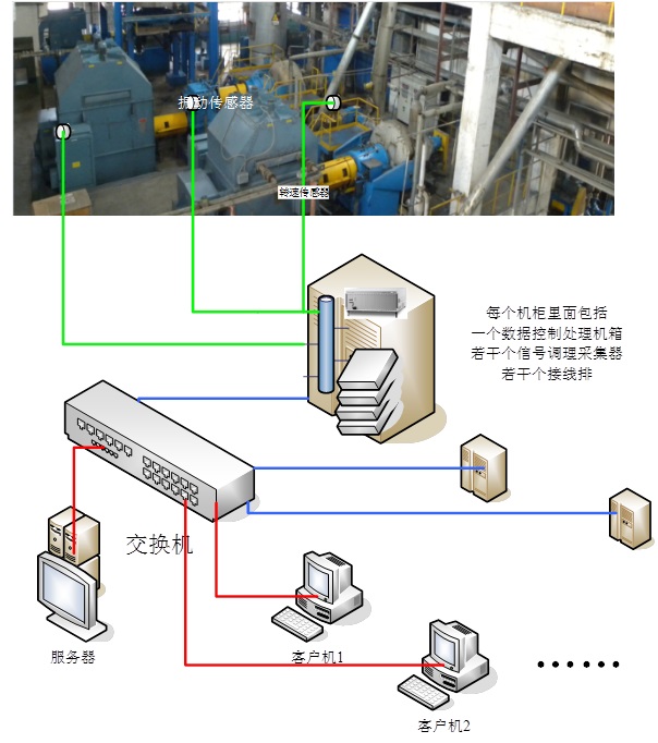 “大型生產(chǎn)線在線監(jiān)測及故障分析系統(tǒng)”利用傳感器檢測、信號處理、計算機技術(shù)、數(shù)據(jù)通訊技術(shù)和旋轉(zhuǎn)機械的故障診斷相關(guān)技術(shù),由振動加速度傳感器、智能信號調(diào)理采集器、嵌入式信號采集與服務(wù)平臺等硬件,以及信號采集程序、網(wǎng)絡(luò)服務(wù)器程序和振動監(jiān)測與故障分析客戶端程序等軟件兩部分組成。這主要考慮到咱們設(shè)備的重要性、分散性和測點數(shù)量的規(guī)模性。