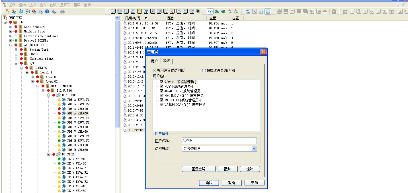 本系統(tǒng)采取C/S模式,在服務(wù)器端運行數(shù)據(jù)庫SQL Server,嵌入式采集平臺上運行采集程序,在局域網(wǎng)上任意一臺計算機上安裝客戶端程序,登錄用戶名和密碼可以訪問任意子系統(tǒng)。 系統(tǒng)采集軟件可以任意設(shè)置所有振動測點名、測點參數(shù)、采樣時間、采樣頻率、采樣長度、傳感器類型、傳感器靈敏度、控制開閉、地址設(shè)置等。具有當(dāng)今國際經(jīng)典監(jiān)測與診斷軟件的風(fēng)格和功能。