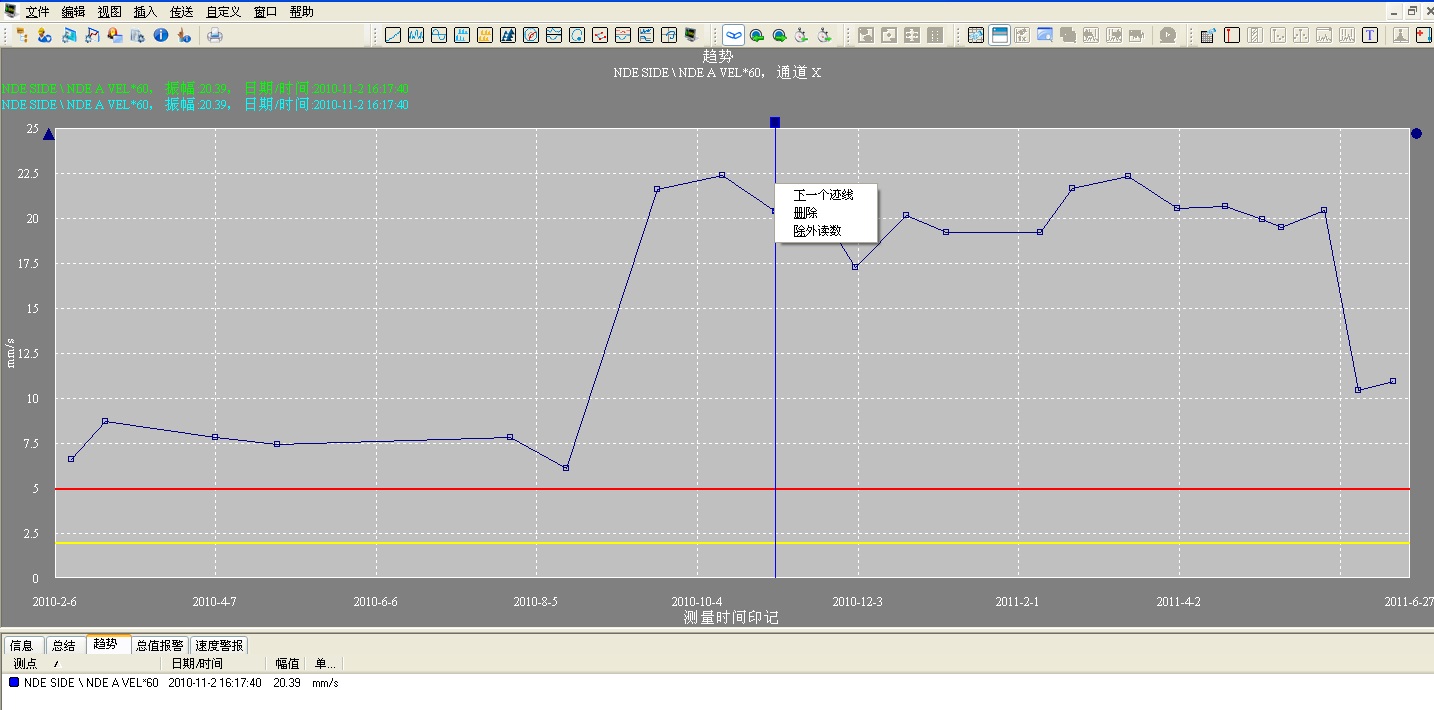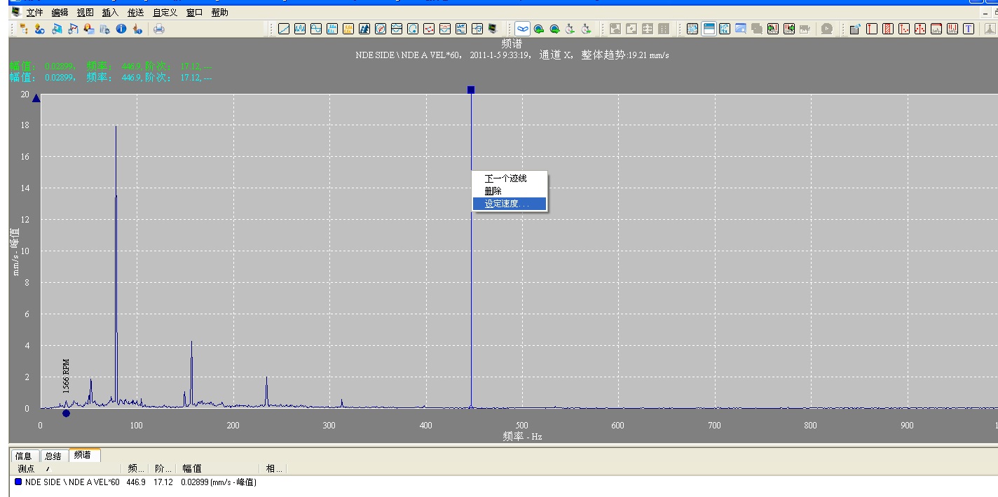 2)頻譜圖:Y軸單位可選:m/s2、um、mm/s,指標(biāo)計算方法可選:峰值、峰峰值、均方根值,由用戶在頻域圖點鼠標(biāo)右鍵選擇。頻譜圖上可以選擇疊加另一次的頻譜。