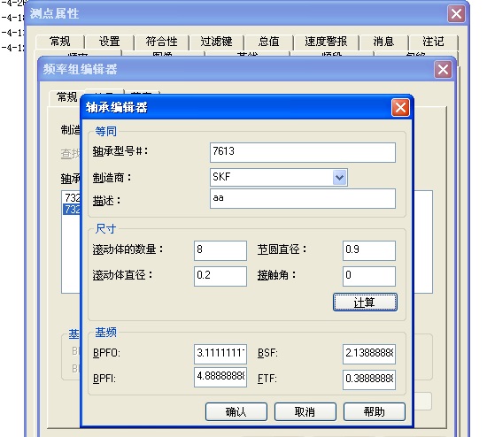 機器節(jié)點屬性的“頻率”屬性是由用戶選擇特征頻率組,如:軸承型號,若系統(tǒng)沒有該軸承,由用戶添加。如下圖:
