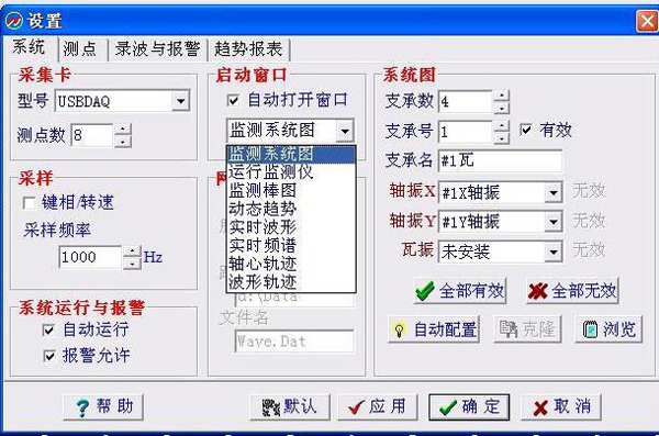 簡介: BVM-300-8V軟件VMAS(VMAS,即Vibration Monitoring and Analysing System 的簡稱)是微機管理的多通道旋轉機械振動監測分析與故障診斷系統。它集振動等信息采集、時頻域分析與故障診斷于一身。由于采用了多項新技術,具有極高的綜合性能指標。該軟件主要包含的功能模塊有:設置模塊、監測模塊、分析模塊、故障診斷模塊(含電機診斷)、工具模塊(含動平衡功能)、報表模塊等。 設置: 設置功能提供了整個系統工作參數、方式等的全面配置功能。